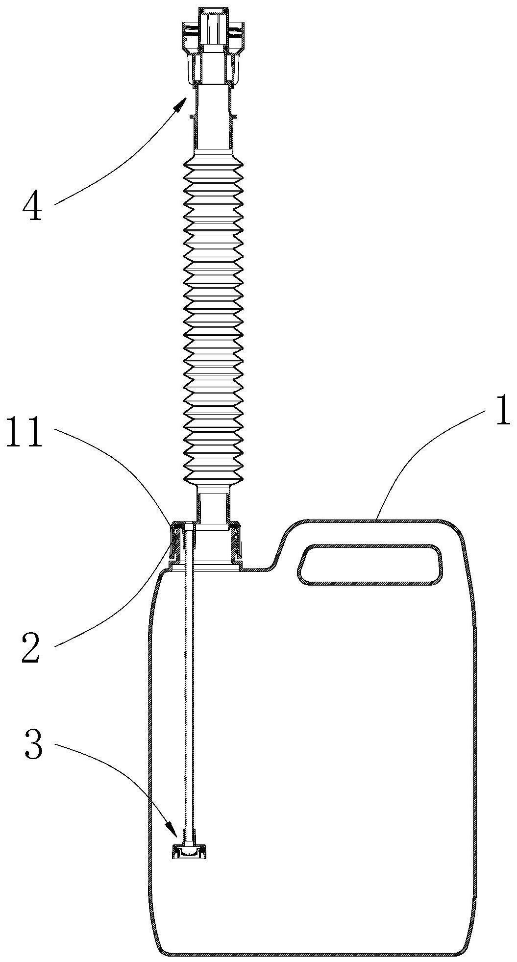 本發(fā)明公開了一種溶液加注裝置,包括上部具有開口的容器、與開口連接的第一蓋體、設(shè)于第一蓋體上的進(jìn)氣口和出液口、與進(jìn)氣口連通的且位于容器中的進(jìn)氣組件、與出液口連通的且位于容器外的出液組件;進(jìn)氣組件包括上端部與進(jìn)氣口連通的進(jìn)氣管、連接在進(jìn)氣管下端部的單向閥,單向閥向下伸入容器中的深度為h,容器的高度為d,其中h≥d/2。本發(fā)明溶液加注裝置,操作簡單,加注效率較高,對瓶子的材質(zhì)要求相對較低。